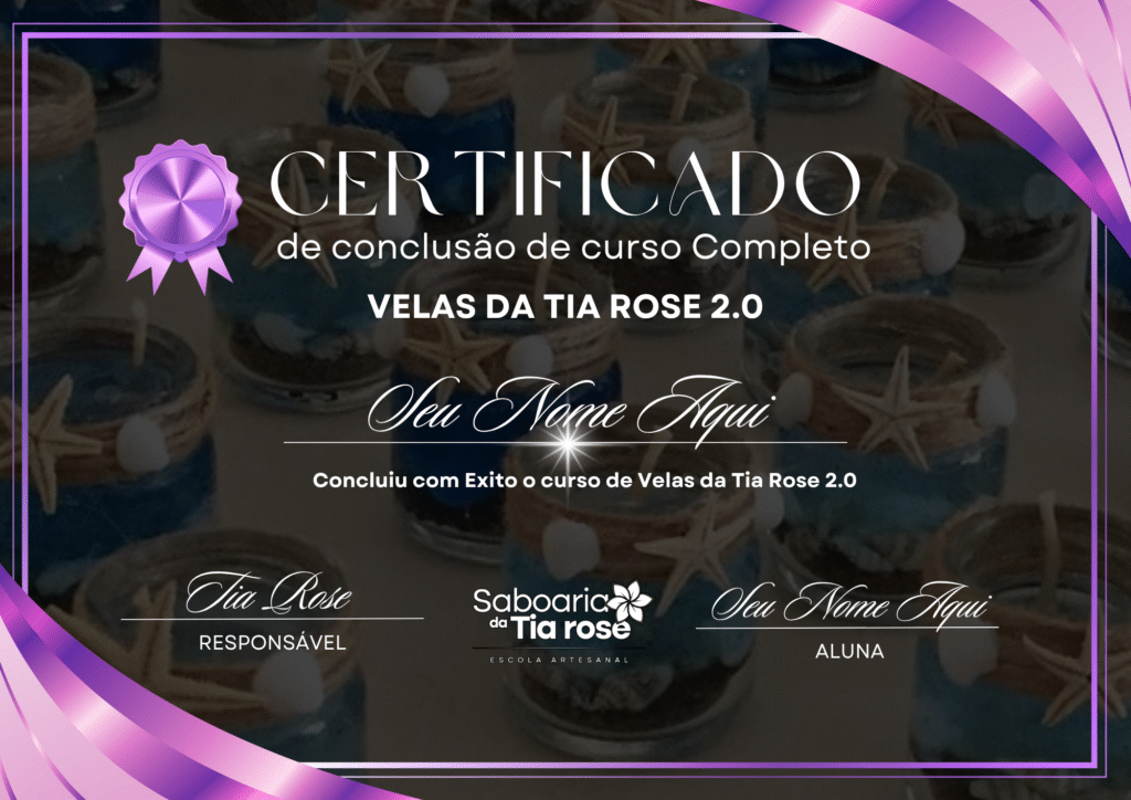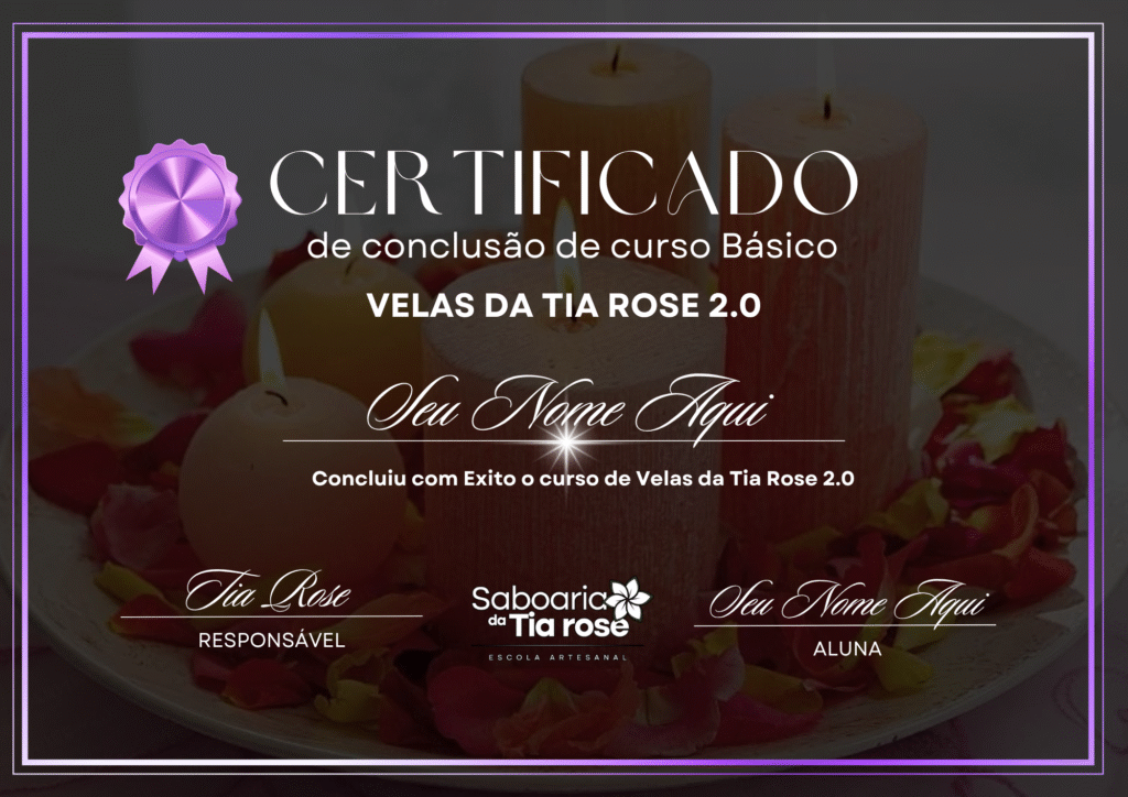 Ao concluir, você receberá o seu certificado personalizado, do novo Curso de Velas da Tia Rose 2.0, com a merecida aprovação de competência, pronto para ser impresso e exposto em seu Negócio ou na sua Casa!